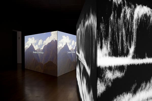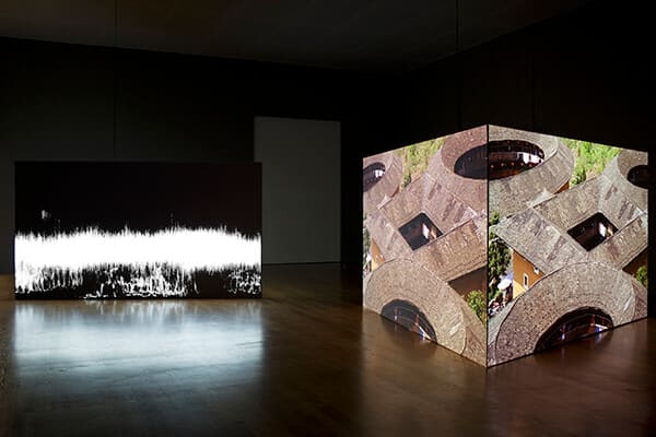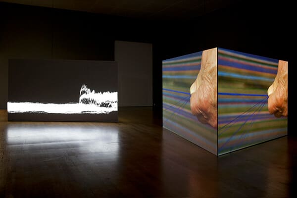 02 [Left] Thread Routes – Chapter I 2010, Single Channel Video, 24:52 loop, Sound / [Right] Thread Routes – Chapter IV - Lightwaves 2010/2016, Single Channel Video, 27:48 loop, Sound
