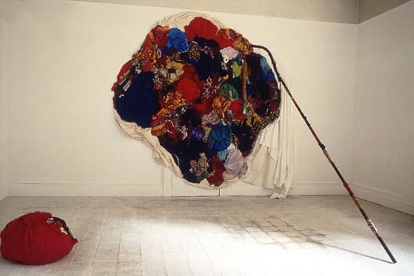 Used Clothing Fragments, Acrylics, Chinese Ink on Canvas, Bamboo Poles, Copper Line