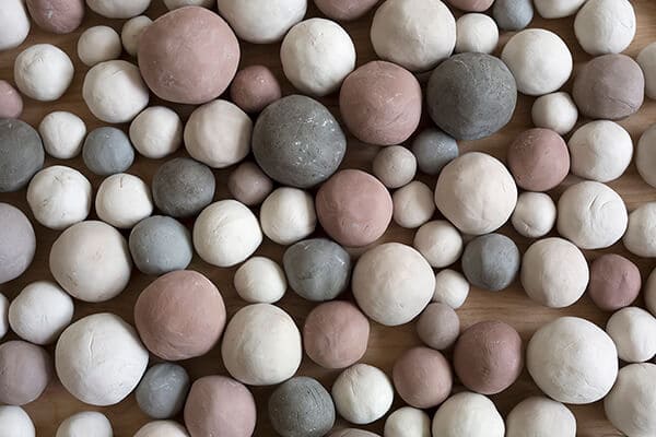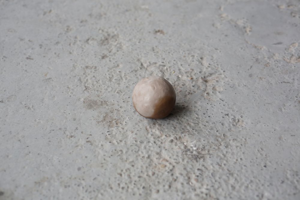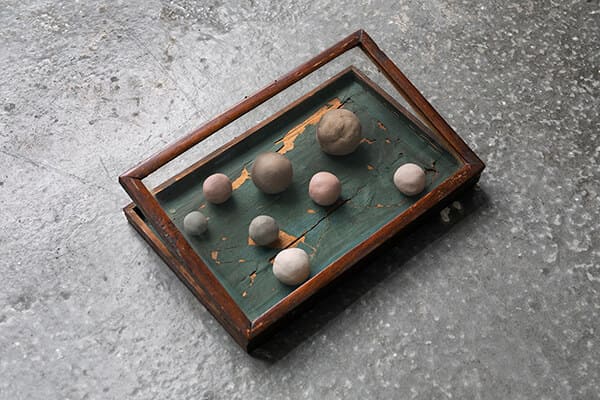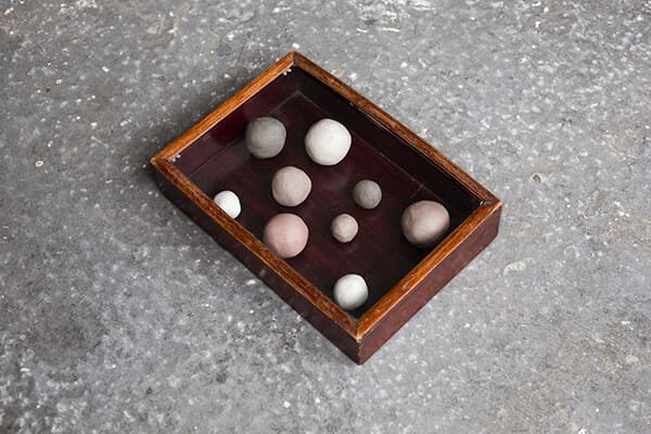 Archive of Mind offers the artist’s reflections on the canonical problem of the act of making and will transform with audience participation throughout the exhibition period. Expanding on the artist’s concept of “Bottari” as a method of wrapping, this participatory workshop invites the audience to roll a lump of clay into spherical forms on a 19 meter long wooden table, which doubles as a canvas. The cyclical act introduces a polarity between symmetrical forces of the participants’ palms that