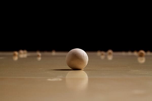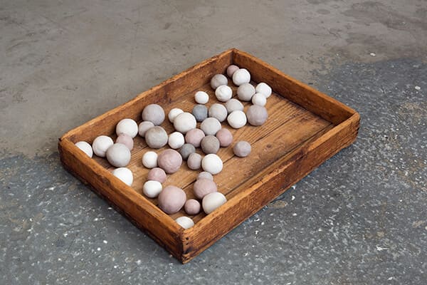 2016/2017, Participatory Site-specific Installation Consisting of Assorted Clay Balls, Elliptical Wooden Table, and sound performance Unfolding Sphere(2016), Dimensions Variable