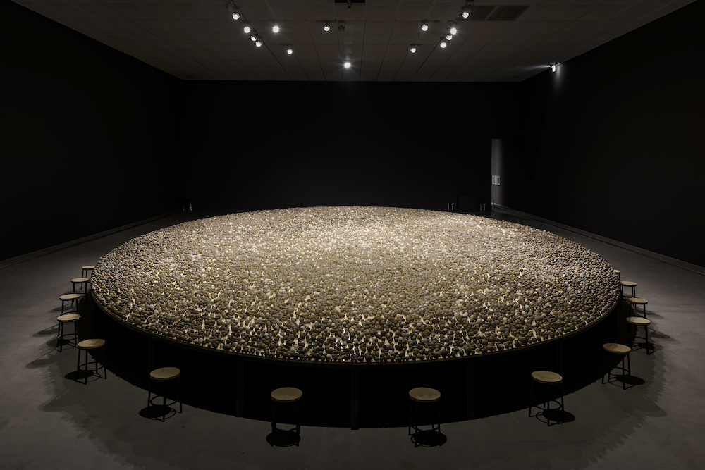 07: 마음의 기하학 / Archive of Mind, 2016, participatory site specific installation consisting of clay balls, 19 m elliptical wooden table, and sound performance Unfolding Sphere, 2016, Installation at Kimsooja - 마음의 기하학 / Archive of Mind at MMCA, Seoul, Photo by Jeon Byung Cheol, Courtesy of MMCA and Hyundai Motor Co. and Kimsooja Studio