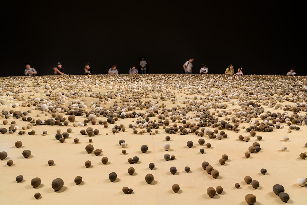 01 - 06: 마음의 기하학 / Archive of Mind, 2016, participatory site specific installation consisting of clay balls, 19 m elliptical wooden table, and sound performance Unfolding Sphere, 2016, Installation at Kimsooja - 마음의 기하학 / Archive of Mind at MMCA, Seoul, Photo by Aaron Wax, Courtesy of MMCA and Hyundai Motor Co. and Kimsooja Studio