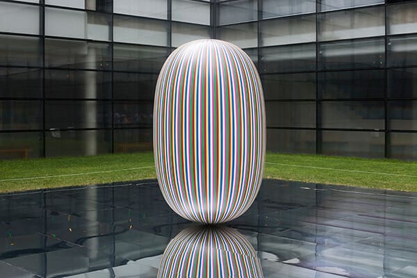 Presented in the museum’s courtyard is Deductive Object, a large-scale ovoid sculpture suspended on a mirrored plinth. Light diffracting film installed along the courtyard’s windows unfolds sunlight into a radiant color spectrum, while the sculpture’s “Obangsaek” (Korean traditional colors) surface enfolds the visible spectrum back into a geometric definition. This work is inspired by the Indian tradition of Brahmanda Stones, also known as “cosmic egg,” signifying the birth of totality