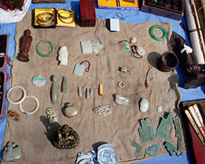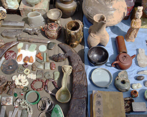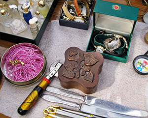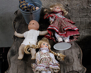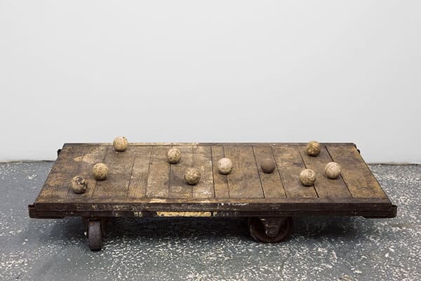 Antique Wooden Cart, 9 Ceramic Balls, 1 Clay Ball