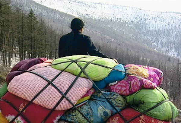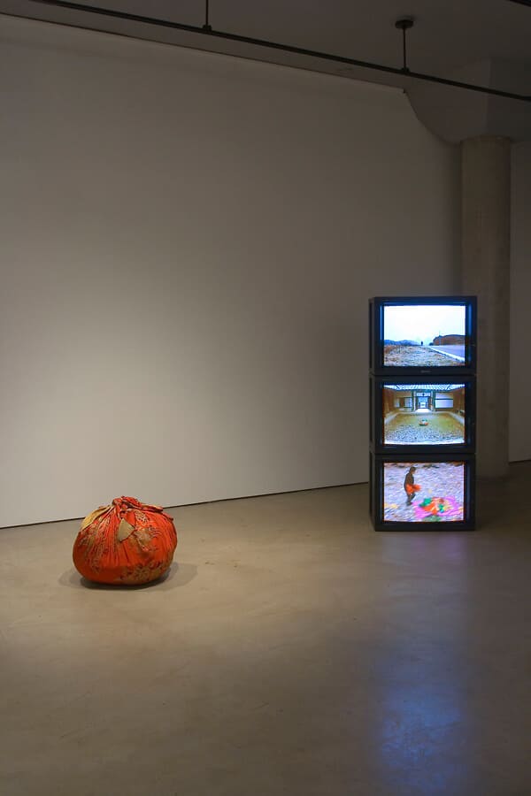 Bottari, Used Korean Bedcovers, Used Clothing + Three Channel Video (Kyungju: 19:40 loop, Yangdong Village: 2:41 loop, Mai Mountain: 1:43 loop), Silent