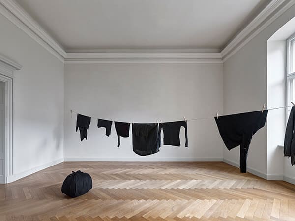Site-specific Installation Consisting of Used artist's clothing, Clothesline, Clothespins, and Black Bottari