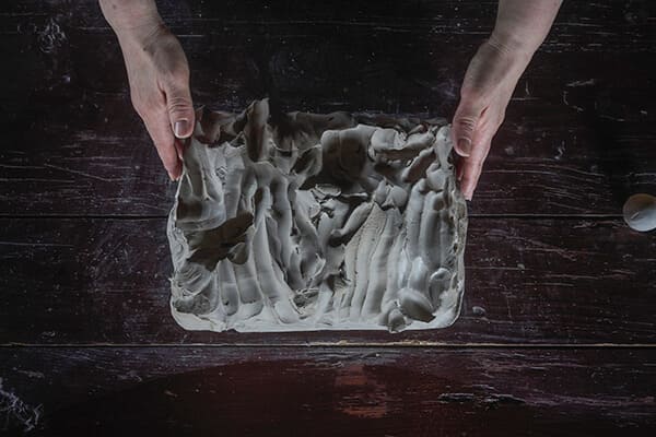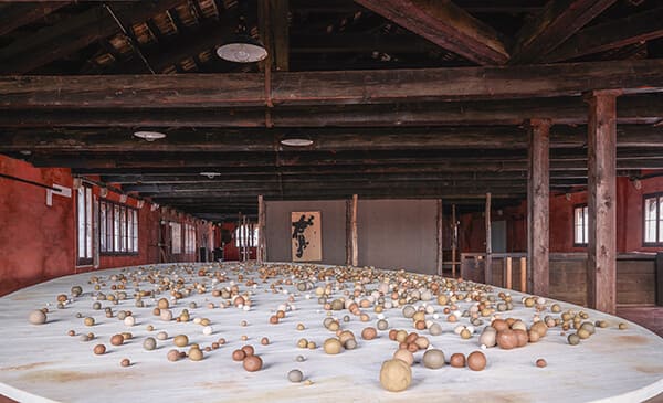 2016/2017, Participatory Site-specific Installation Consisting of Assorted Clay Balls, Elliptical Wooden Table, and sound performance Unfolding Sphere(2016), Dimensions Variable
