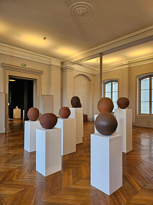 03 – 04 Archive of Mind, 2016/2019, participatory site-specific installation consisting of clay balls, 18m elliptical wooden table, and sound performance Unfolding Sphere, 2016. Installation view at Palais des ducs d'Aquitane, Courtesy of the City of Poitiers, Axel Vervoordt Gallery and Kimsooja Studio. Photos by Jan Liegois.