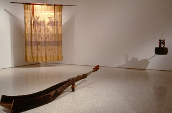 01 Deductive Object – Golden Flag, 1991, Used Bedcover, Bamboo, Used Cloth, Copper Line, 241.5 x 218 x 5.5 cm / Deductive Object, 1991, Cloth on Found Object / Deductive Object – Drum and Reel, 1990-1991, Used Korean Clothing Fragments and Acrylic on Drum and Reel, 65.2 x 39.5 x 39.5 cm