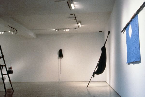 03 Deductive Object – Helmet, 1991, Judo Mask, Used Korean Clothing Fragments, Acrylics, 53 x 18 x 27.5 cm / Deductive Object, 1991, Used Woman's Skirt, Copper Line, Fabric, Shovel, 198 x 30 x 25 cm / Deductive Object – Blue Flag, 1991, Used Cloth, Bamboo, Acrylic, 76 x 185.4 x 4 cm