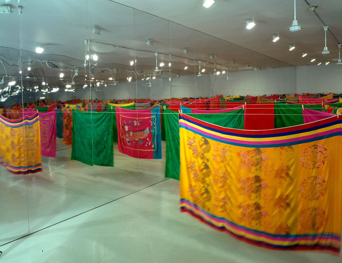 A Mirror Woman, Korean Bedcovers, Mirrored Walls, Four Industrial Fans, Cables, Clothespins, Tibetan Monk's Chant, Dimensions Variable