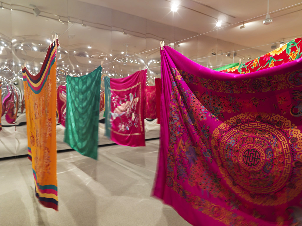 12 A Mirror Woman, 2002/2013, Korean Bedcovers, Mirrored Walls, Four Industrial Fans, Cables, Clothespins, Tibetan Monk's Chant, Variable