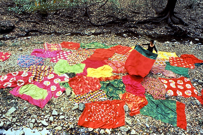 After she came back to Korea, these changes persisted. In her recent works, nature appears in relation of unity with given space. It is not an accidental encounter with nature but an intentional communication with nature. The unity of human beings with nature is emphasized. Lying in the Nature 1994, which was made in the valley of Oksanseowon in Kyungju, shows the unity of color-striped cloth objects with nature. It is a feature of life which transcends time and space.
