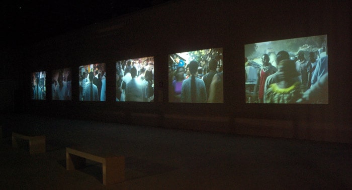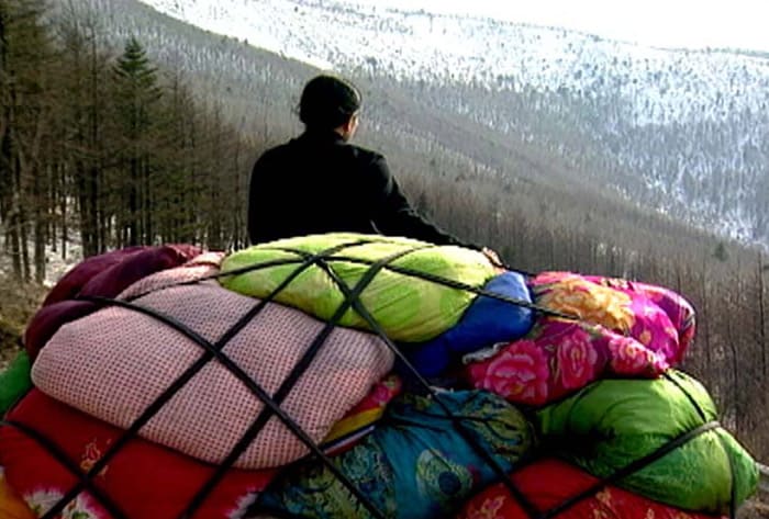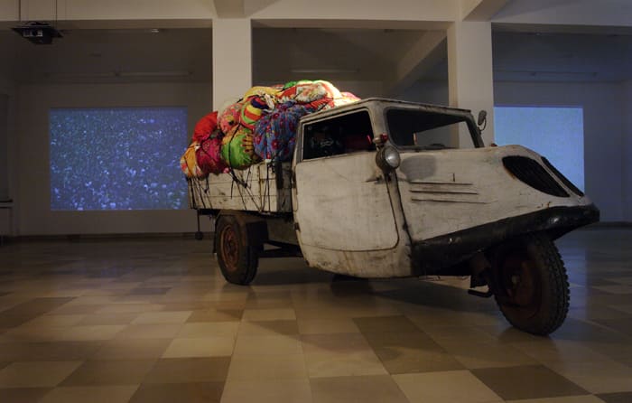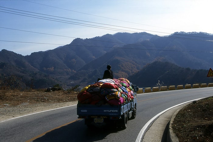In November 1997, Soo-Ja Kim made a performance trip across her country, North to South and East to West with a lorry loaded with several dozen bottari. From her 11-day trip she made a 33-minute film: Bottari - Truck. The view of the lorry going through towns and countryside is accompanied by the artist's voice repeating the name of the place she's travelling through. There is something of the ceremonial in this call: incantation or anamnesis bringing the past up to the present. But the lorry doesn't stop either in the past or the present; it continues on its way. Even if it returns to the starting point, it must go on. The artist says that Bottari - Truck is in memory of her family who moved house frequently and also that it is her story as an artist going from town to town to discover new places and meet different people. This performance, which in fact shows pure mobility, causes us to reflect on contemporary society whose technology and networks are creating nomadism on a planetary scale.