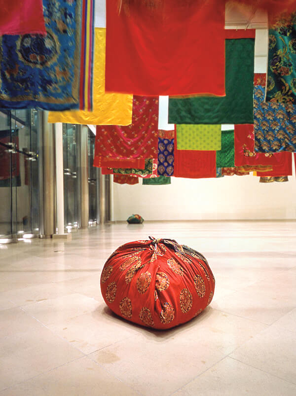 In 1992 she began working with bottari-Korean wrapping cloth usually tied into a bundle for carrying various household goods. She regarded bottari as being similar to the body, which can also be bundled and wrapped. The cloth, in her view, was like a skin. Bottari also has significance as a container, or vessel, for carrying and transporting all sorts of goods. When a cloth is spread out it invites people in, and when it is used to wrap something it signifies parting, or may even suggest notions of travel. In Korea, the words "to wrap in a bundle" mean to part, especially when a woman leaves home. Typically Kim's installations incorporate an abundance of the brightly coloured bottari which are carefully arranged or stacked by the artist. They demand a physical interaction from the viewer which eventually translates into a powerful emotional involvement. Piles of bottari lend an unrestrained physical presence and invest the work with a personal history. They suggest something nomadic, unstable, and have a haunting quality that takes us into realms of perception and imagination. By employing the fabric in her artmaking, Kim also marks activities of everyday life which have been carried on by Korean women for generations.
