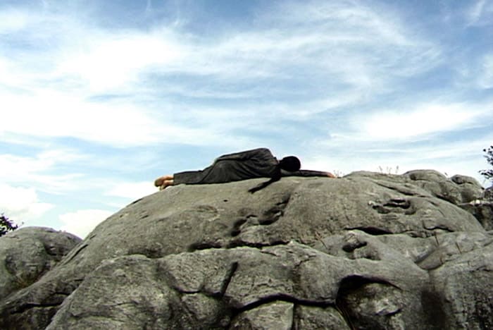 In a way this work looks a little bit like the reclining Buddha, parinirvana; but, abandoning my ego, at the same time, in a different way, I consider it as a form of crucifix. My body is located at the central point of four different elements which are in-between the sky and the earth, nature and human beings. I located myself on the borderline of the earth and the sky, facing nature and away from the viewers. In the beginning of the video I think my body looks fragile and dramatic, feminine and provocative: an organic body or a body of desire. Over time, I find that my body, with its duration of stillness — breathing in the rhythm of nature — becomes a part of nature as matter itself, neutral, a transcendent state. To me it is like offering and serving my body to nature.