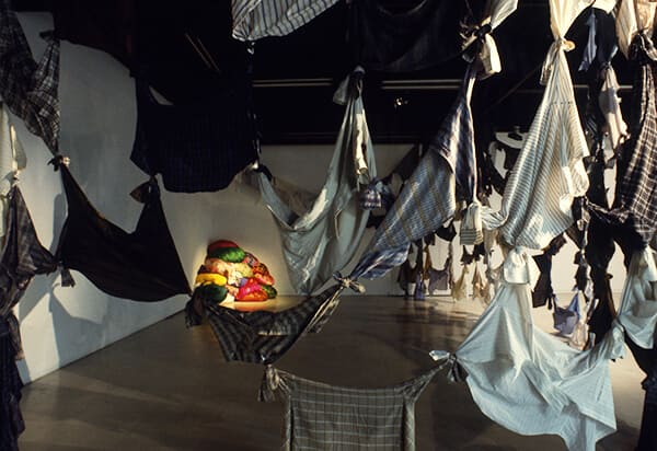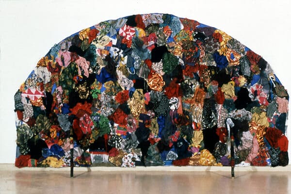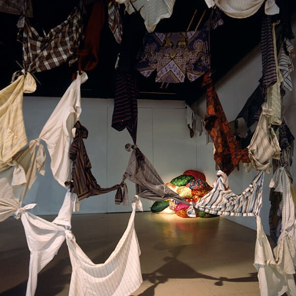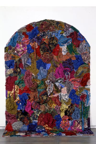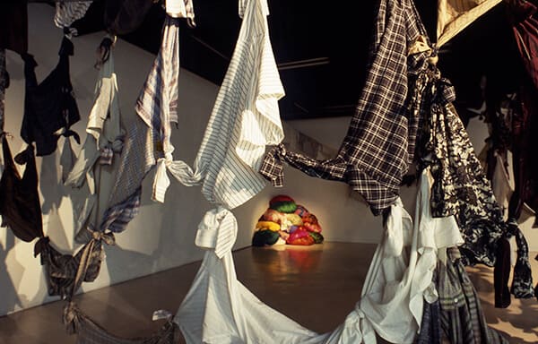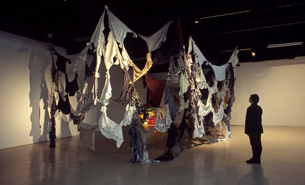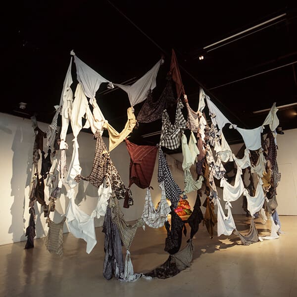 Used Clothing Fragments, Acrylics, Chinese Ink on Canvas, Bamboo Poles, Copper Line