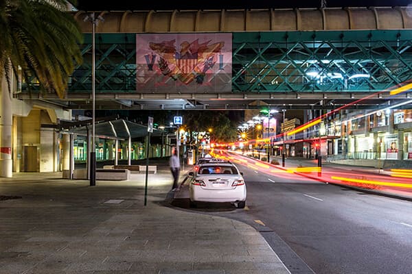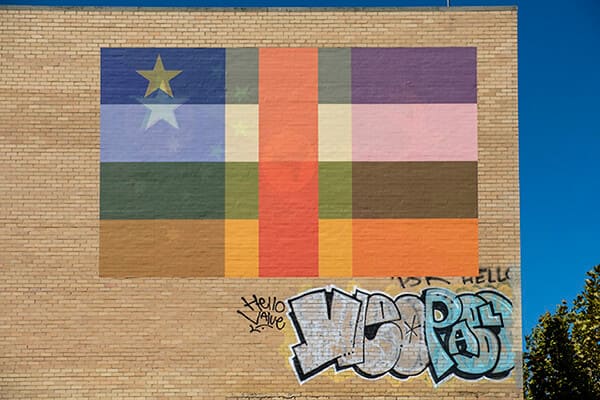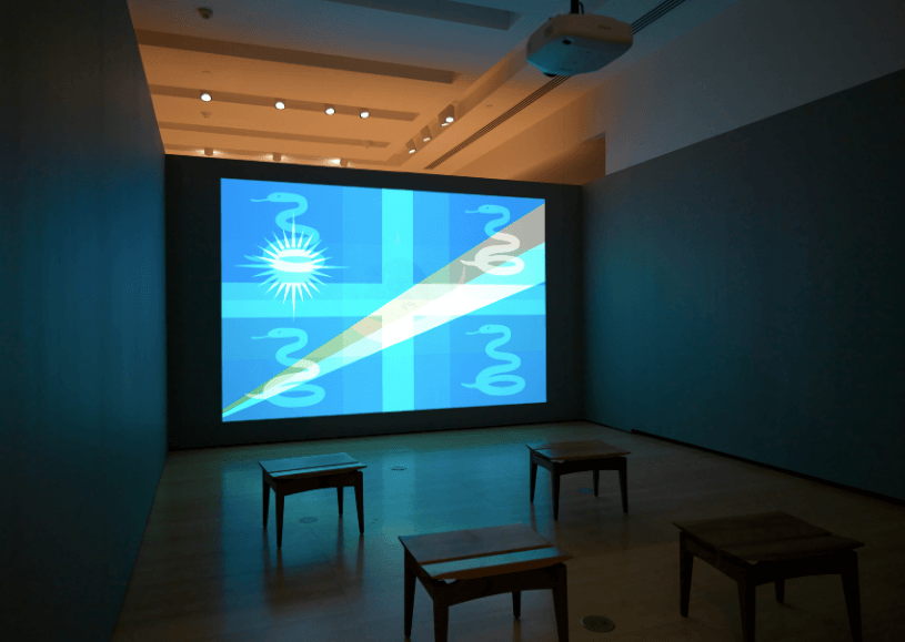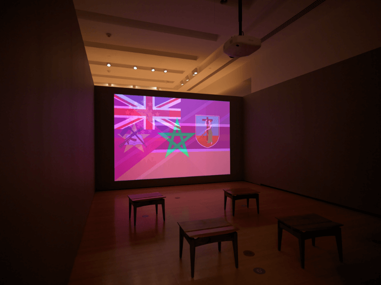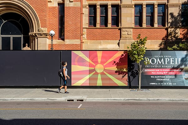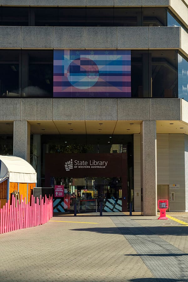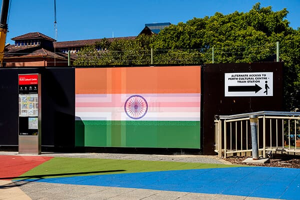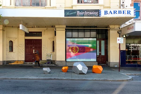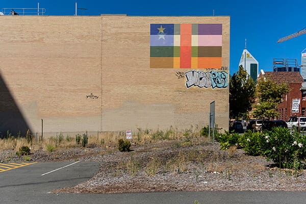 The exhibition extends beyond the walls of PICA, with the same colorful layered flags appearing on public facades throughout Northbridge and the Perth CBD. The flags, at such a monumental size, placed in the most central parts of Perth, produce an inescapable encounter despite their imaginary status.