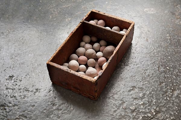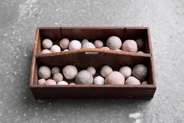 Archive of Mind offers the artist’s reflections on the canonical problem of the act of making and will transform with audience participation throughout the exhibition period. Expanding on the artist’s concept of “Bottari” as a method of wrapping, this participatory workshop invites the audience to roll a lump of clay into spherical forms on a 19 meter long wooden table, which doubles as a canvas. The cyclical act introduces a polarity between symmetrical forces of the participants’ palms that