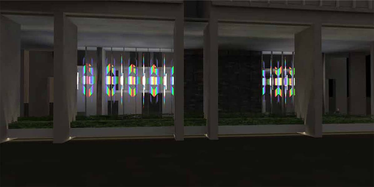 Presented in the museum’s courtyard is Deductive Object, a large-scale ovoid sculpture suspended on a mirrored plinth. Light diffracting film installed along the courtyard’s windows unfolds sunlight into a radiant color spectrum, while the sculpture’s “Obangsaek” (Korean traditional colors) surface enfolds the visible spectrum back into a geometric definition. This work is inspired by the Indian tradition of Brahmanda Stones, also known as “cosmic egg,” signifying the birth of totality