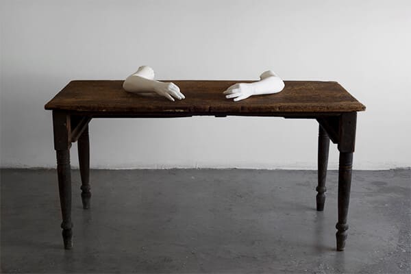 이 작품은 작가의 양팔을 캐스팅 한 것으로, 두 손이 서로를 향해 마주보고 있으며 엄지와 검지가 맞닿아 빈 공간을 감싸는 형태를 이루고 있다. 손의 포즈는 바늘과 실이 없음에도 불구하고 자연스럽게 바느질 행위를 연상시키며, 동시에 작가가 지속적으로 탐구해온 ‘만들지 않기(non-making)’와 ‘무위(non-doing)’의 원칙을 암시한다. 손의 제스처로 만들어진 사이의 빈 공간은 찰나적 순간을 포착하는 동시에, 물리적 존재가 기묘한 부재를 함께 내포하는 역설적 상태를 형상화한다. 또한 이 손 모양은 불교 전통에서 지혜와 깨달음을 의미하고, 개인과 우주적 존재의 연결을 상징하는 지혜수인(智慧手印)을 떠올리게 한다.