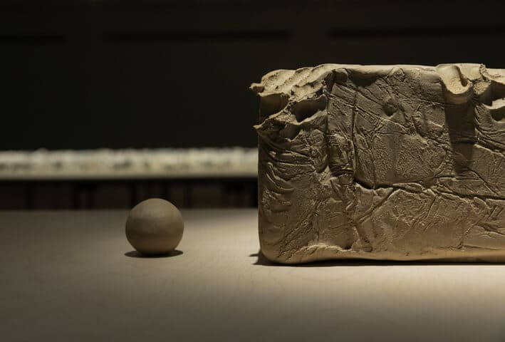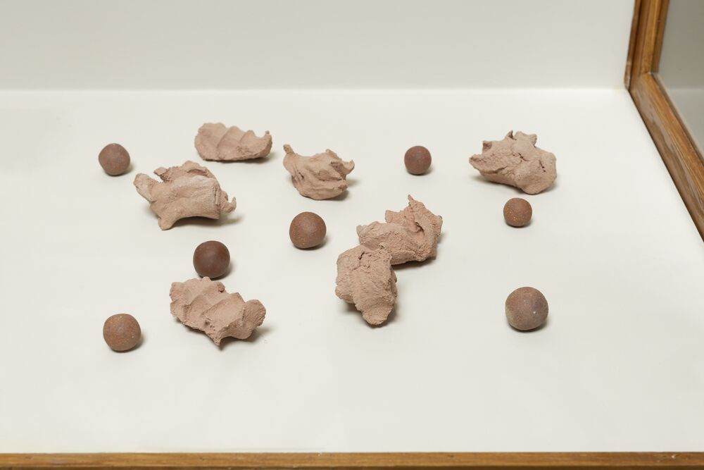 Ceramics exemplify a transcultural practice that connects human rituals with nature by integrating earth, water, fire, and air. As part of the moon jar series, Kimsooja conceived the large stoneware and the smaller spheres and chunks as variations of bottari. The act of spinning a pottery wheel parallels a process of emptying the center, while an instance of grabbing or circling two palms around a mass of earth registers a center that is full. The stoneware’s asymmetrical form, which the artist describes as recalling the shape of a face, creates a dialogue with the hand-shaped clay beside it; all suggest a portrait of our body and our mind.