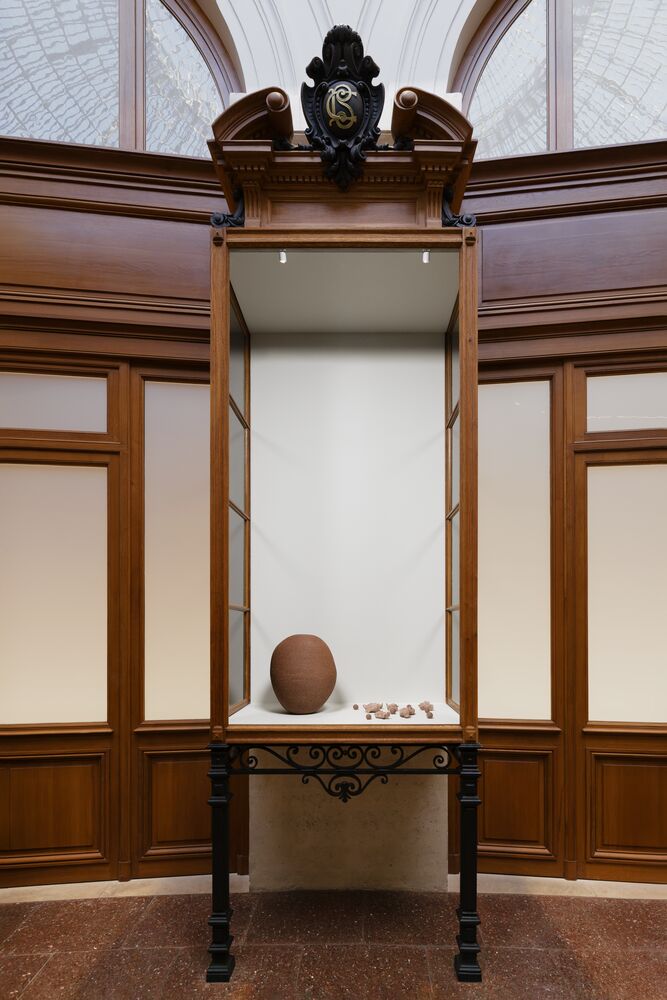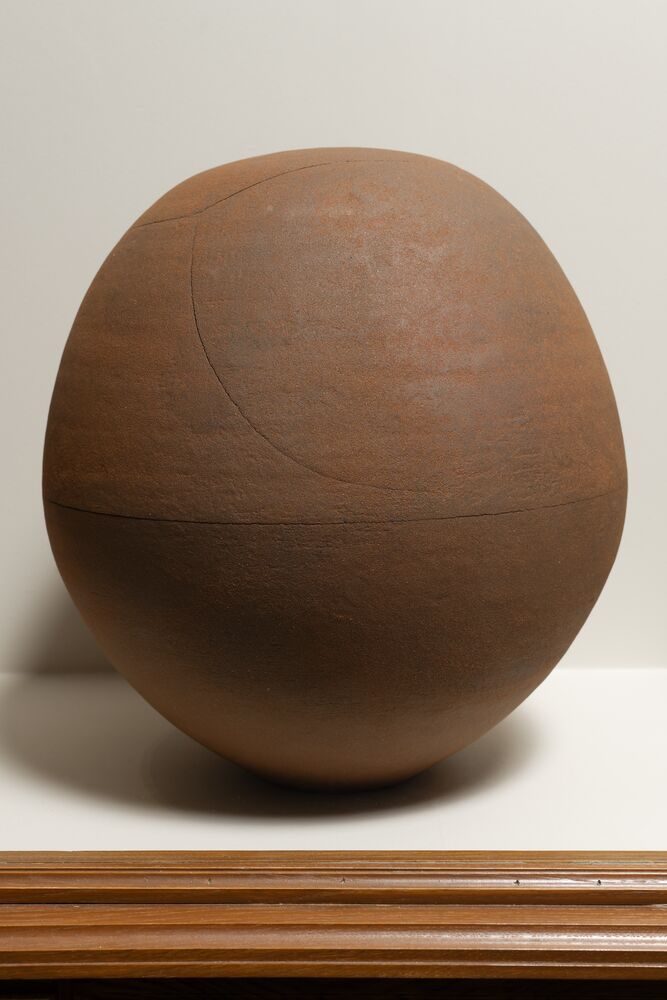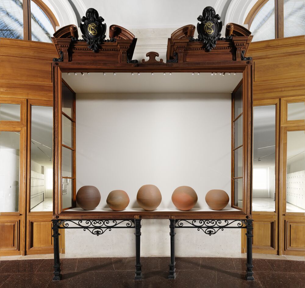 Moon jar is a traditional Korean ceramic dating from the eighteenth century, known for evoking the full moon through its round shape and brilliant color. Irregularities in the material texture and a slight asymmetry caused by the assembly of upper and lower bowls in the shape of hemispheres are the essence of its beauty, where the aesthetic imperfection makes the object even closer to nature. This series of five moon jar-shaped sculptures (out of nine as a set of installation in stoneware and terracotta) was made in collaboration with the artisans at the Manufacture de Sèvres. Kimsooja conceptualizes the moon jar as a bottari (bundle of fabric in Korean), a concept of wholeness and totality, which she developed over the past 40 years of her artistic practice.