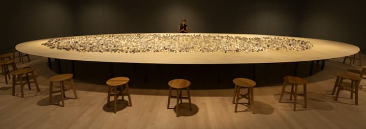 2016/2019, Participatory Site-specific Installation Consisting of Clay Balls, 18m elliptical wooden table, and sound performance Unfolding Sphere(2016)