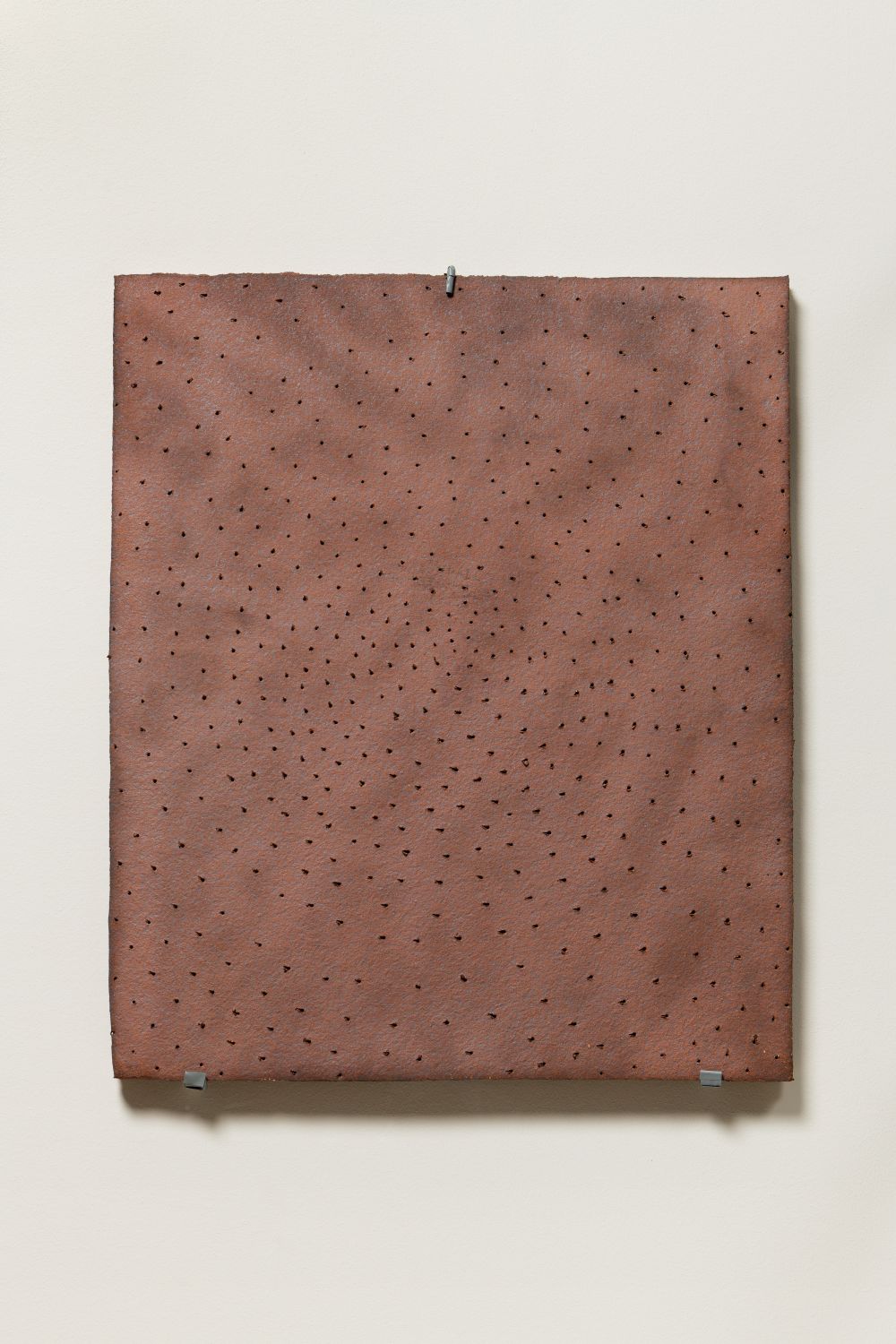 Sewing Into Soil: Invisible Needle, Invisible Thread was made in collaboration with the artisans at the Manufacture de Sèvres. The artist pierces the stoneware panel with a needle, creating a constellation of holes that records the artist’s vertical action onto a horizontal surface. It is closely associated with the act of sowing on soil, which marks a beginning of painting for Kimsooja. In dialogue with this panel in relief, Deductive Object – Bottari conceptualizes the form of moon jar, a type of traditional Korean ceramic dating from the eighteenth century. This vessel forms through the logic of wrapping, which parallels that of making a bottari (Korean cloth bundle), to contain an interior punctured by a needle hole at the top.
