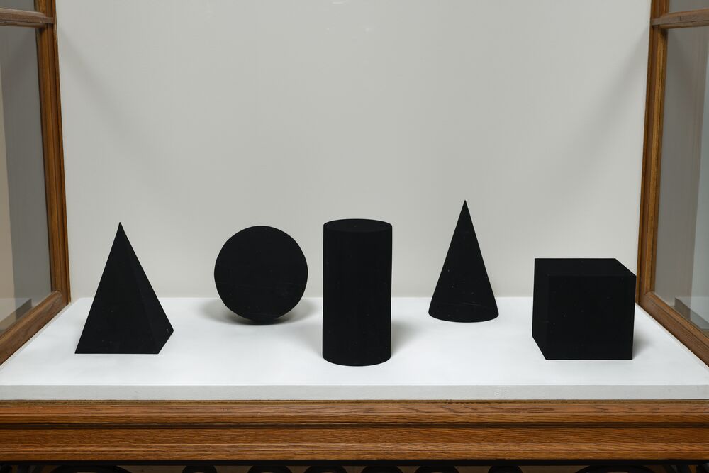 Deductive Object – Black Garden comprises five geometric forms painted in a deep black hue. The surface of these forms absorbs enough light to make them appear bi-dimensional, opening a space of uncertainty. Though it is black, there is an absence of shadow, and thus an absence of light; it embraces all colors, but resists our discernment. This investigation into color, light, and primitive symbols resonates with the notion of duality, which has been a recurring motif in Kimsooja’s body of work. The geometric structures present in Kimsooja’s art often disclose contrasting forces inherent in art and life—light and shadow, interiority and exteriority, and life and death.