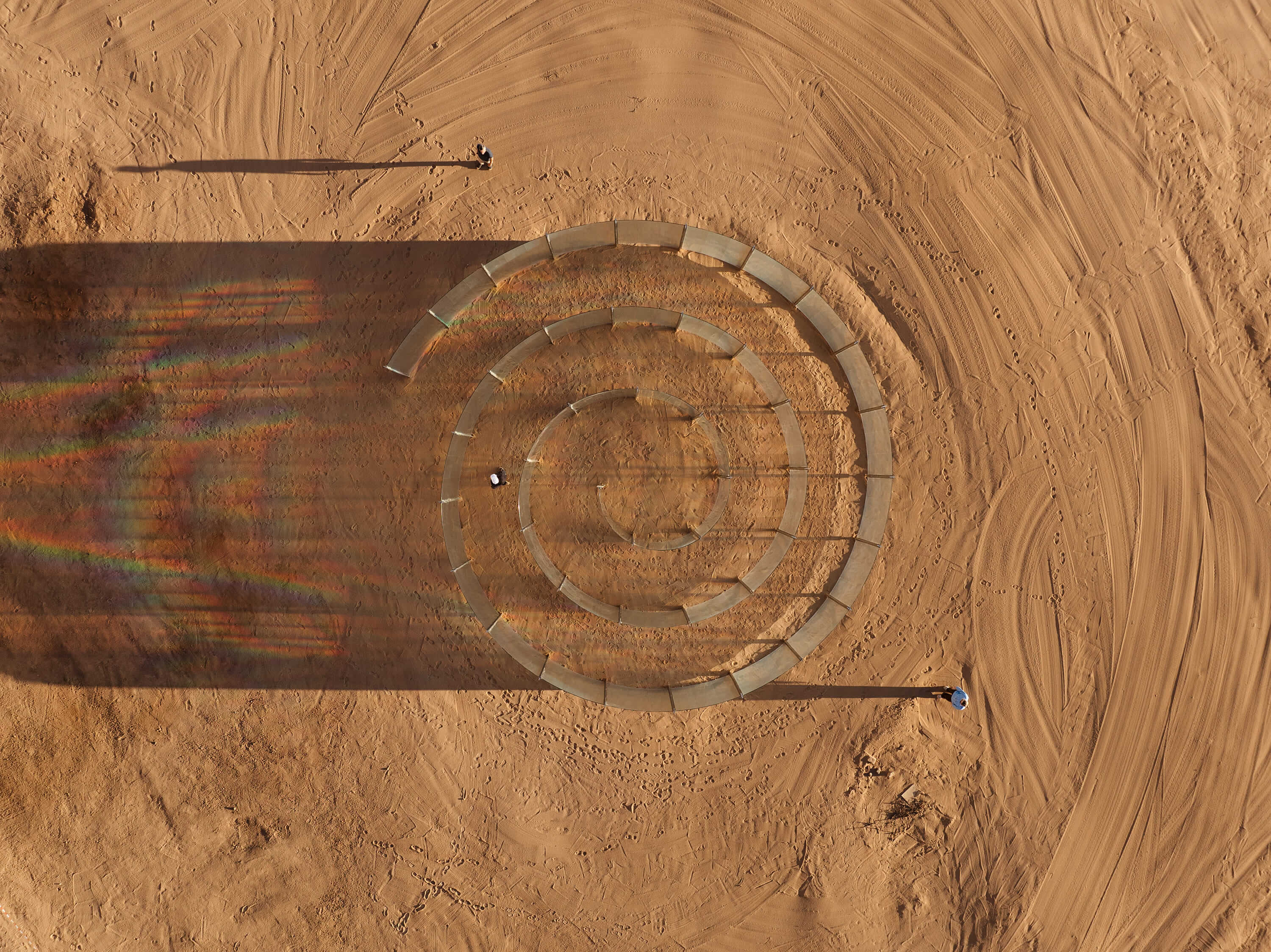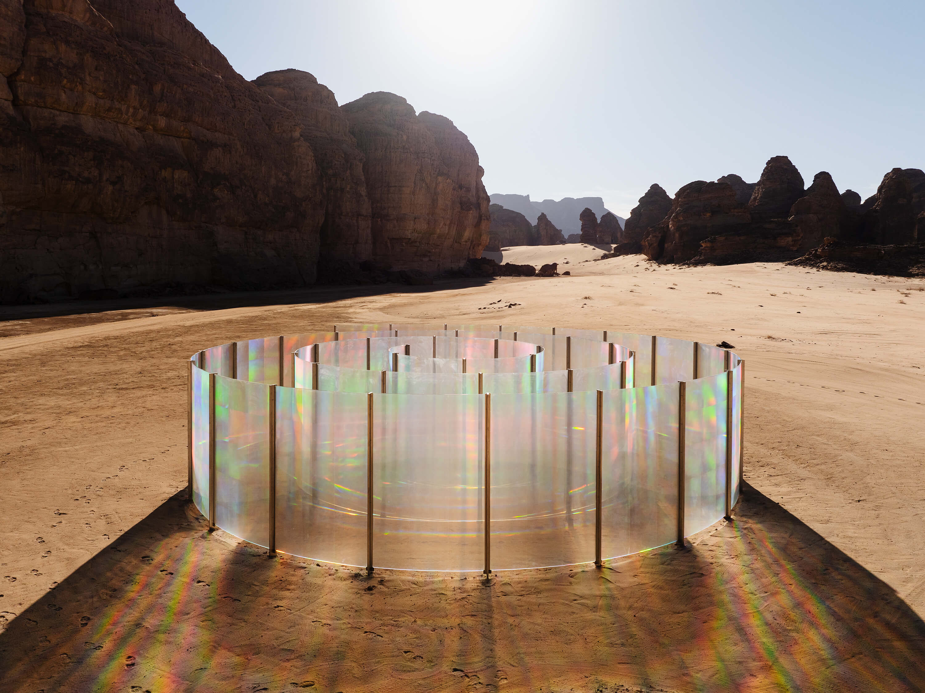The movement of wind and the path of light – which reflects, refracts, and traverses through the spiral paths of To Breathe – AlUla’s glass walls – echo the conceptual and geometrical formation of the desert landscape. Coated with a special film, the glass is a translucent canvas with a microstructure of thousands of vertical and horizontal grooves that function as prisms. Sunlight refracts through this surface into an iridescent color spectrum, casting rainbow-colored shadows and circular brushstrokes onto the sandy earth. Audiences partake in a contemplative performance by walking through and gazing at the shifting light spectrums that render visible the vibrations of colors normally invisible to the naked eyes. With Kimsooja’s words, “it is a walk in and out of a contained yet open spiral path that unfolds an abstract ‘lightscape’ – at once a drawing, a painting, and a sculpture.”