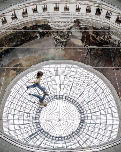The mirror that she has used to cover the floor of the Rotunda of the Bourse de Commerce plays a similar role to that of the needle or of her own body.